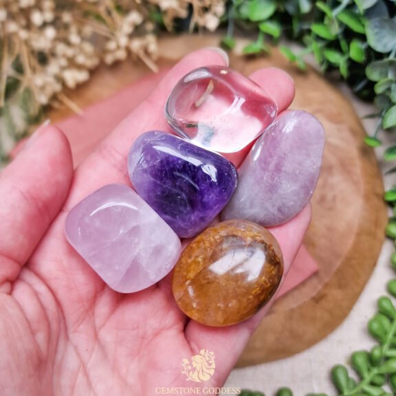 Tijdens momenten van onrust of twijfel helpt lavendelkwarts je om terug te keren naar rust en zielsvertrouwen. Rozenkwarts opent je hart, zodat liefde en compassie vrij kunnen stromen, zowel naar jezelf als naar anderen. Amethist brengt helderheid en spirituele verbinding, helpt je loslaten wat niet langer bij je past en opent de weg naar intuïtieve inzichten. Gebruik bergkristal om je intenties te versterken en je energieveld te zuiveren; deze steen fungeert als een lichtversterker voor al het werk dat je doet. Golden healer helpt om die hogere frequentie in je lichaam te integreren, zodat spirituele inzichten ook in de fysieke wereld gestalte kunnen krijgen.