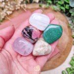 Rozenkwarts opent het hart voor liefde, zelfacceptatie en vergeving. De steen helpt oude pijn los te laten en opnieuw vertrouwen te vinden in liefde, voor jezelf én anderen. Rhodoniet brengt evenwicht tussen emoties en verstand; hij helpt vergeving en begrip te laten stromen, vooral in relaties waar oude wonden geheeld mogen worden. Mangano calciet straalt een troostende, koesterende energie uit die je omhult met zachtheid. De steen helpt je om spanning te verzachten en jezelf met mildheid te benaderen. Groene aventurijn herstelt hoop, harmonie en vertrouwen, en nodigt uit tot optimisme bij een nieuw begin. Maansteen verbindt je met intuïtie en vrouwelijke wijsheid, helpt emoties in balans te brengen en ondersteunt innerlijke rust.