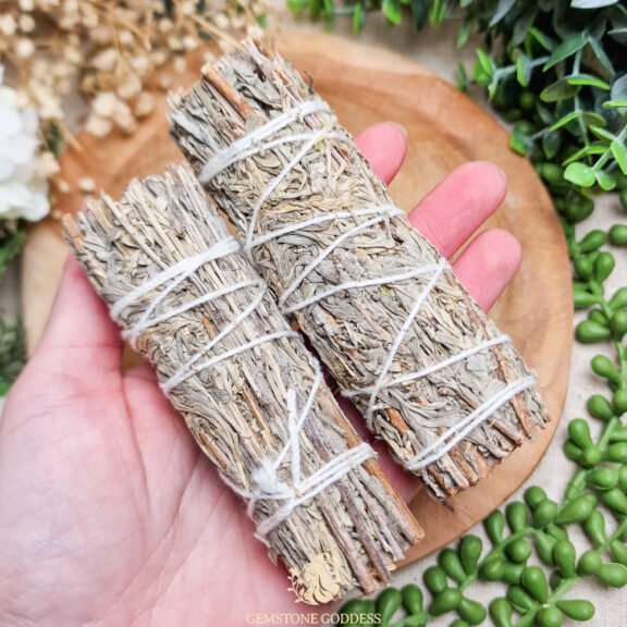 Elke smudge stick is een unieke creatie van de natuur, variërend in grootte, vorm, kleur en patroon. Je ontvangt één (1) hand geselecteerde smudge stick. Geschatte afmetingen: 10-11 cm lang, 4 cm dik. Wil je er meer ontvangen? Pas dan eenvoudig de hoeveelheid aan in het keuzemenu. Elke smudge stick wordt zorgvuldig en duurzaam verpakt, klaar om zijn natuurlijke schoonheid en energie in je leven te brengen.
