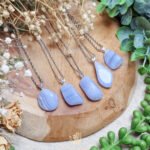 - Draag blue lace agaat als sieraad of draag een steen bij je voor rust, zelfexpressie en emotionele verzachting. Leg op je keelchakra of houd vast tijdens gesprekken, healing, meditatie of zang. Houd vast wanneer je wilt spreken vanuit zachtheid, je stem wilt bevrijden of vrede wilt brengen in je communicatie — zowel met jezelf als met anderen.