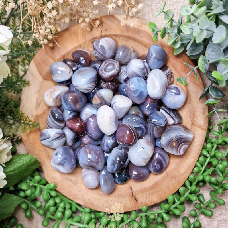 - Botswana agaat wordt, zoals de naam al zegt, gewonnen in Botswana. De steen staat bekend om haar fijne bandpatronen en warme, zachte kleuren. In spiritueel werk wordt ze gewaardeerd voor haar troostende, stabiliserende energie en haar vermogen om transities soepeler te laten verlopen.