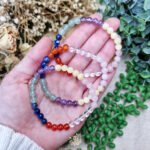 • Deze combinatie helpt je om in balans te blijven tijdens drukte of verandering. Carneool geeft motivatie en daadkracht, gele calciet helpt bij helder denken en zelfvertrouwen, groene aventurijn ondersteunt optimisme, rozenkwarts brengt zachtheid en mildheid naar je innerlijke dialoog, sodaliet bevordert helder communiceren, amethist helpt bij mentale ontspanning en inzicht, en bergkristal brengt structuur en focus. Ideaal voor wie zijn gedachten wil ordenen en bewuster wil leven.