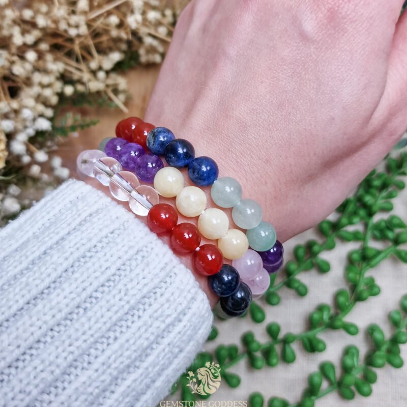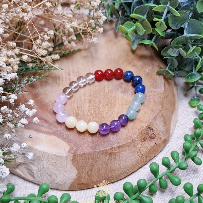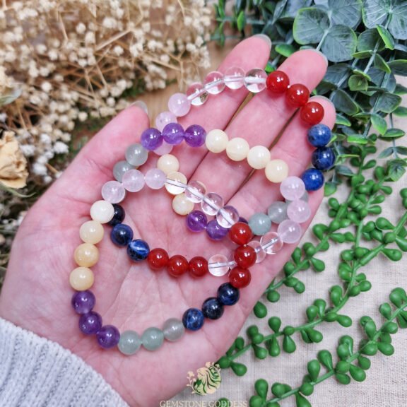 - Elke steen in deze armband ondersteunt een specifiek chakra en draagt bij aan een energetisch gebalanceerd geheel. Carneool activeert je levenskracht en creativiteit, gele calciet verheldert je persoonlijke krachtcentrum en brengt optimisme, groene aventurijn opent het hart voor liefde en groei, rozenkwarts verzacht en heelt je emoties, sodaliet opent de keel voor eerlijke communicatie, amethist verbindt je met je intuïtie en hoger bewustzijn, en bergkristal versterkt het hele systeem en zuivert energie. Samen vormen ze een harmonieus netwerk van chakra-activatie, zelfheling en spirituele integratie.