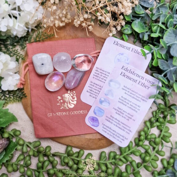 De vijf stenen van het element Ether vormen een heilige ruimte van stilte, licht en liefde. Hun energie opent het bewustzijn, zuivert de geest en verbindt je met de subtiele dimensies van zijn. Deze combinatie helpt je om contact te maken met je hogere zelf, je gidsen en de universele stroom van bewustzijn. Ze nodigt je uit om niet te streven, maar te zijn, in vertrouwen, in vrede, in verbinding met alles wat leeft.