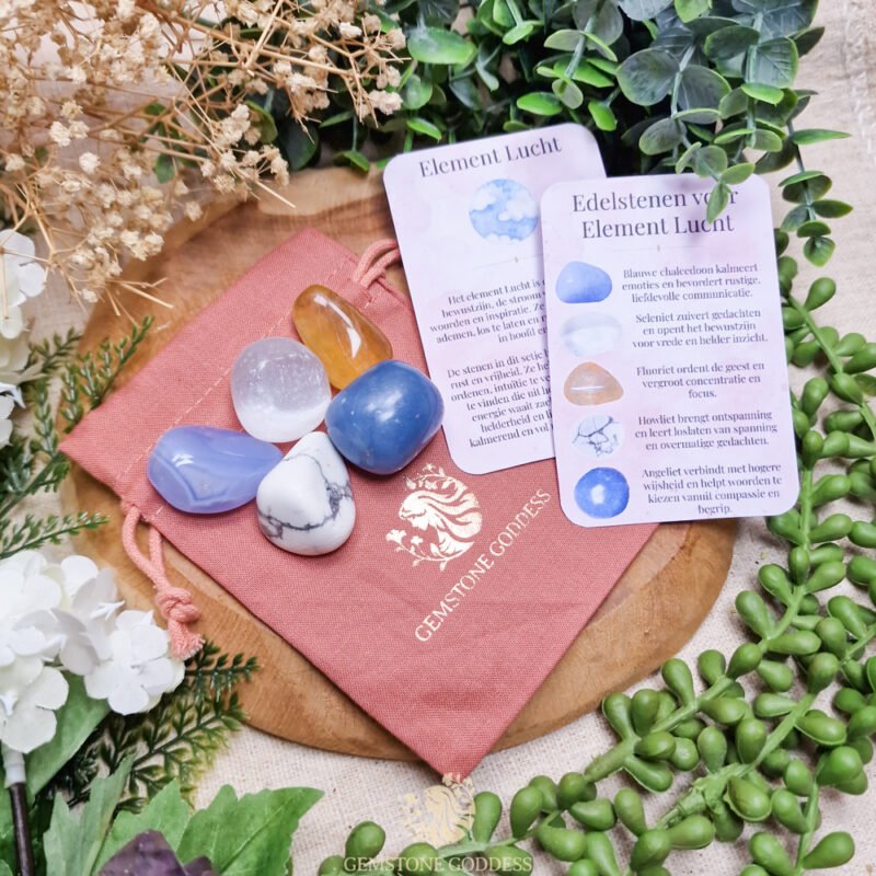 De vijf stenen van het element Lucht brengen helderheid, rust en ruimte in hoofd en hart. Ze nodigen je uit om bewust te ademen, gedachten te laten stromen en inzicht te vinden in stilte. Deze combinatie helpt om woorden te vinden voor wat je voelt, om helder te communiceren en om de verbinding tussen verstand en intuïtie te versterken.