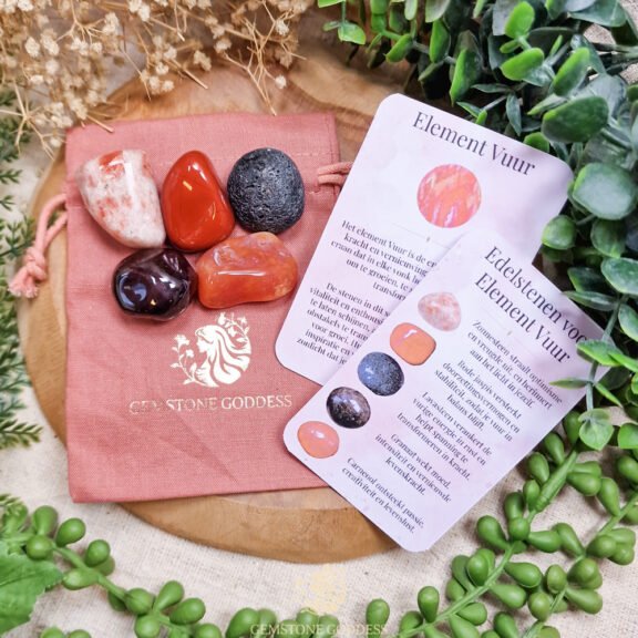 De vijf stenen van het element Vuur dragen de energie van beweging, passie en innerlijke kracht. Ze wekken het vuur van je ziel, herinneren je aan je levenslust en moedigen je aan om te creëren, te handelen en jezelf te laten zien. Deze combinatie helpt je om angsten te transformeren in kracht, vermoeidheid in inspiratie en twijfel in daadkracht.
