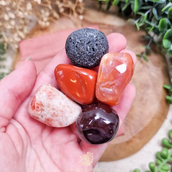 Carneool is de vonk die het vuur ontsteekt: ze wekt levensvreugde, creativiteit en moed om nieuwe stappen te zetten. Haar warmte activeert het sacrale centrum en herinnert je aan de vreugde van het léven zelf. Rode jaspis brengt stabiliteit en standvastigheid, ze voedt het vuur zonder dat het te heet wordt, en helpt volhardend te blijven in wat echt belangrijk is. Granaat ontsteekt het diepe innerlijke vuur van hart en ziel: ze geeft passie, regeneratie en de kracht om jezelf opnieuw uit te vinden. Zonnesteen straalt optimisme, zelfvertrouwen en levenslust uit, als zonnestralen die je hart verwarmen. Ze herinnert je eraan dat vreugde niet gezocht hoeft te worden, maar van binnenuit geboren wordt. Lavasteen sluit de kring als de oerkracht van transformatie, ze helpt spanning te ontladen, negatieve energie te verbranden en de kracht van vernieuwing te omarmen.