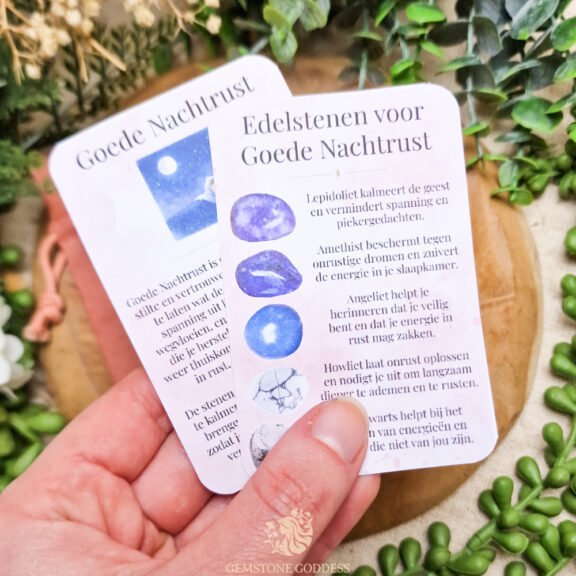 Lepidoliet kalmeert de geest en vermindert spanning en piekergedachten. Ze bevat een natuurlijke rustgevende energie die helpt om stress te verzachten en innerlijke vrede te vinden voor het slapengaan. Amethist beschermt tegen onrustige dromen en zuivert de energie in je slaapkamer. Ze helpt om gedachten tot rust te brengen en bevordert een vredige slaap vol herstel en spirituele harmonie. Angeliet verbindt je met zachte, hemelse energie. Ze omhult je met vrede, troost en geruststelling, alsof je wordt gedragen door licht en liefde. Angeliet helpt je herinneren dat je veilig bent en dat je energie in rust mag zakken.