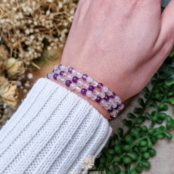 - Deze combinatie vormt een energetisch netwerk dat helpt om je aura te zuiveren, je trilling te verhogen en verbinding te maken met je hogere zelf. Amethist opent het kruinchakra en versterkt je intuïtie, rozenkwarts opent het hart en bevordert zelfliefde en empathie, en bergkristal fungeert als een zuivere versterker die de energie van de andere stenen verdubbelt. Samen creëren ze een heilige ruimte van vrede en heling.