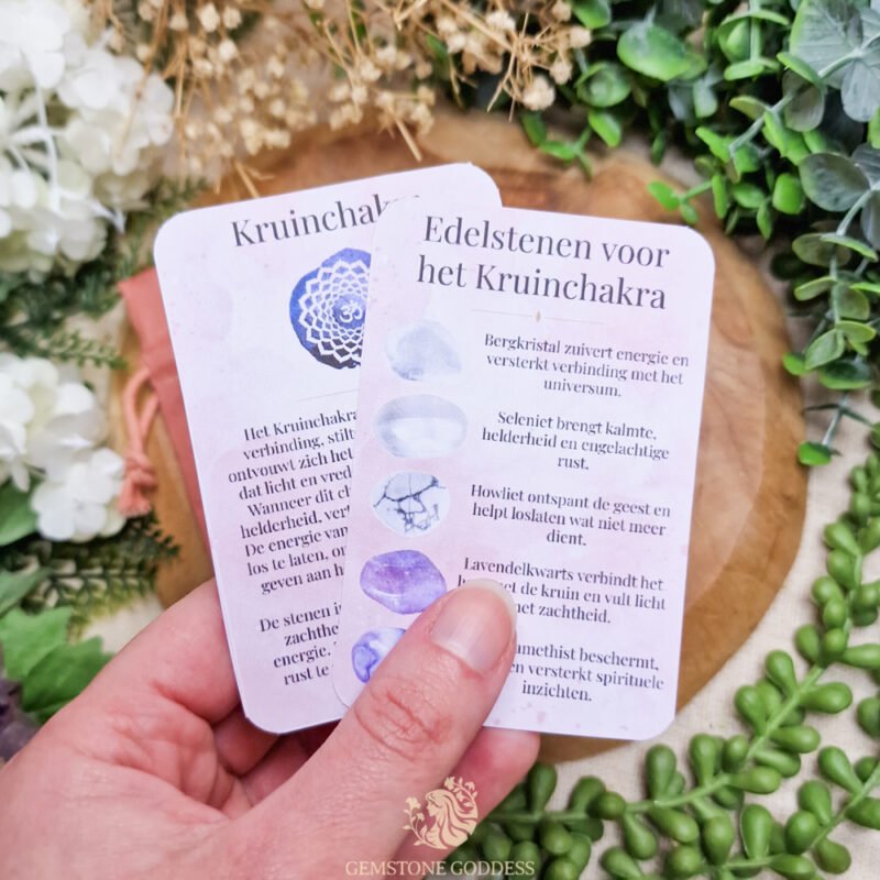 De vijf stenen van het Kruinchakra brengen licht, rust en bewustzijn samen tot een stille harmonie. Ze openen het kanaal tussen jou en het universum, zodat je energie vrij kan stromen van aarde tot hemel. Deze set nodigt je uit om stil te worden, niet door de wereld te vermijden, maar door erin te rusten, als een kalme ademhaling in het ritme van het leven.