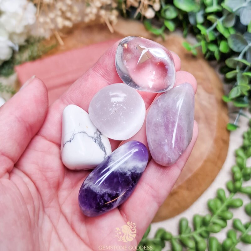 Gebruik deze stenen tijdens meditatie, gebed of momenten van stilte. Leg ze in een cirkel boven je hoofd of houd één steen in je hand wanneer je innerlijke rust zoekt. Je kunt ze ook bij je bed plaatsen om een vredige slaap en heldere dromen te bevorderen. Visualiseer een zachte straal van wit of lavendelkleurig licht die vanuit de hemel neerdaalt en zich in je kruin opent. Laat dit licht langzaam door je hele lichaam stromen, zuiverend, verzachtend en helend, tot je één wordt met die stille gloed van vrede.
