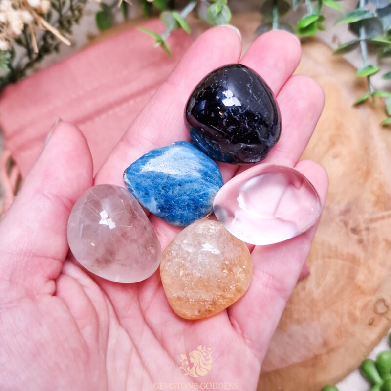 Het getal vijf symboliseert de natuurlijke harmonie van het leven, de dans tussen actie en rust, geven en ontvangen, licht en schaduw. In deze set vertegenwoordigt elke steen een aspect van positieve energie, samen vormend tot een veld van liefde en helderheid.