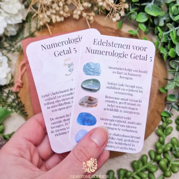 De vijf stenen van getal 5 vormen samen de adem van verandering, een zachte, verfrissende energie die nodigt tot groei, beweging en ontdekking. Ze helpen je om in vrijheid te leven, zonder je houvast te verliezen, en herinneren je eraan dat elke reis begint met een open hart.
