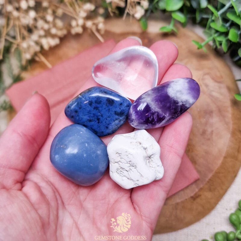Angeliet opent de poort naar hogere begeleiding en engelachtige aanwezigheid. Ze helpt je om boodschappen en ingevingen vanuit het universum te ontvangen met zachtheid en vertrouwen. Dumortieriet brengt structuur en helderheid in deze inzichten; ze helpt je om intuïtieve kennis te begrijpen en toe te passen in het dagelijks leven. Girasol, met haar zachte gloed, weerspiegelt helderheid en zuivere emoties; ze nodigt uit tot introspectie en helpt bij het vertalen van gevoel naar inzicht. Magnesiet omhult je energie met vrede en compassie, ze verzacht spanningen en helpt om spirituele indrukken kalm te integreren. Dream amethist sluit de kring als beschermende gids in de nacht en in het bewustzijn; ze opent het derde oog en brengt rust, vertrouwen en spirituele helderheid.