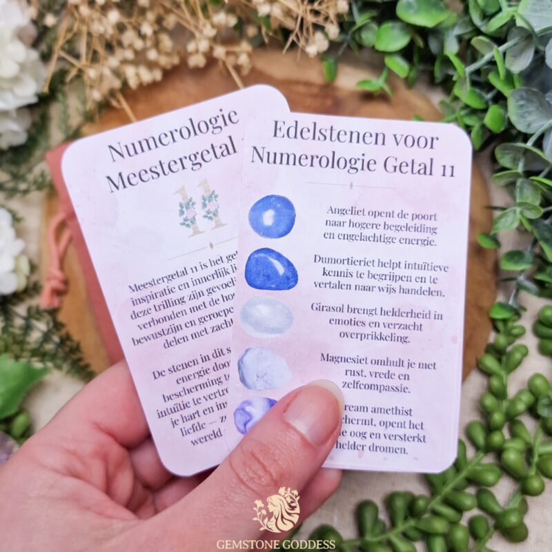 Gebruik deze stenen tijdens meditatie, creatieve inspiratie of momenten van innerlijke afstemming. Leg ze in een cirkel tijdens reflectie, houd angeliet of dream amethist vast voor helderheid, of plaats magnesiet bij je bed voor rust en diepe integratie. Deze stenen kunnen worden gebruikt bij alle numerologische invloeden van meestergetal 11 — of het nu je levenspadgetal, zielsgetal, geboortedag, bestemmings- of persoonlijkheidsgetal is. In elke vorm dragen ze de trilling van inspiratie, bewustzijn en intuïtieve verlichting.