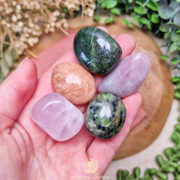 Rozenkwarts is de zachte kern van deze set: de adem van liefde zelf. Ze heelt oude wonden, verzacht verdriet en herinnert je eraan dat liefde de basis is van elke transformatie. Roze maansteen brengt intuïtieve, vrouwelijke energie, ze leert je te voelen, te ontvangen en in vertrouwen te rusten. Fuchsiet voegt de wijsheid van gezonde grenzen toe: ze helpt helers en zorgzamen om niet te veel te dragen, maar licht te delen vanuit balans. Nefriet jade vormt de aardende vrede van deze set; ze brengt harmonie, welbevinden en de rust van het hart dat thuis is in zichzelf. Lavendelkwarts sluit de kring met een trilling van vrede en hogere liefde, ze opent de verbinding tussen hart en ziel, tussen mens en licht.