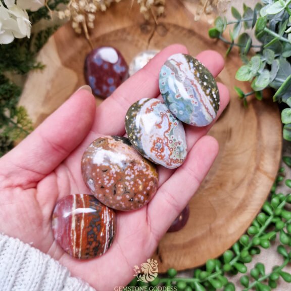 - Naast spirituele toepassingen wordt oceaan jaspis gebruikt in sieraden en decoratieve objecten vanwege zijn unieke patronen en levendige kleuren. Zijn sterkte en duurzaamheid maken hem geschikt voor beeldhouwkunst, mozaïeken en ambachtelijke projecten.