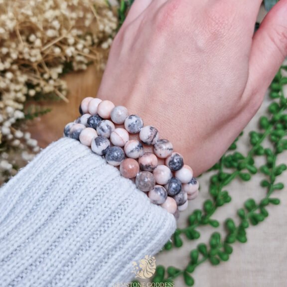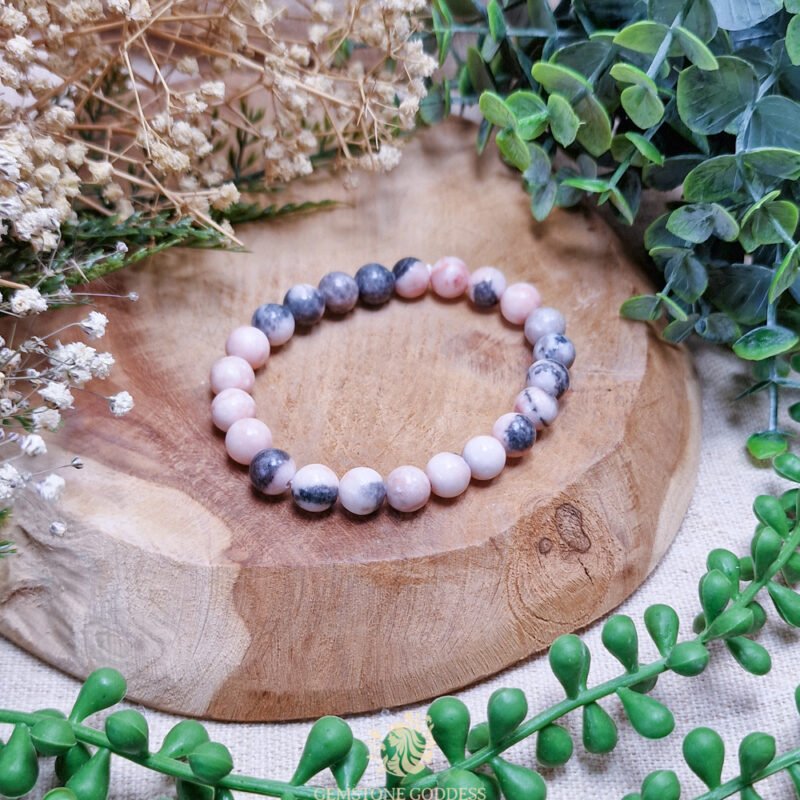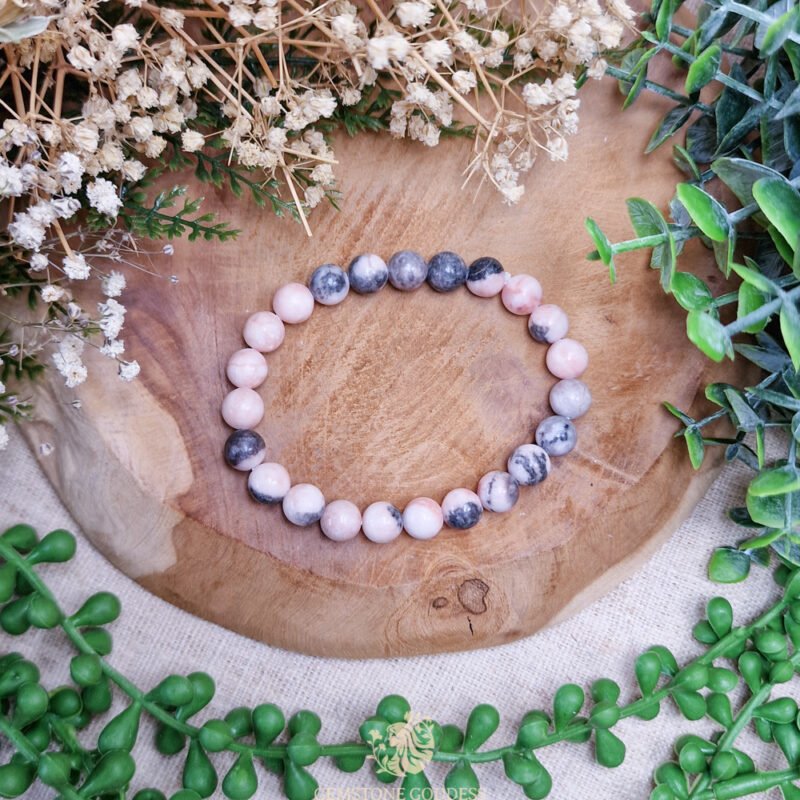 - Roze zebra jaspis kalmeert een onrustige geest, versterkt focus en helpt bij het relativeren van stressvolle gedachten. Ze ondersteunt het vinden van structuur in chaotische situaties en brengt helderheid wanneer je emoties en gedachten met elkaar in conflict lijken. Ze moedigt aan tot mildheid in communicatie en zelfreflectie.