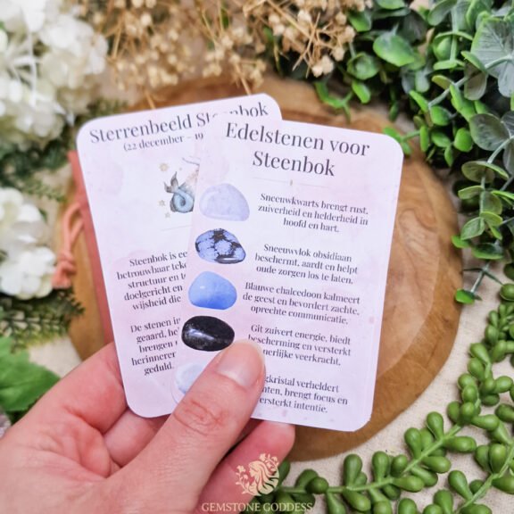 De energie van deze vijf stenen weerspiegelt de standvastige, wijze en kalme aard van Steenbok. Ze helpen je om stevig te blijven staan, helder te denken en innerlijke rust te bewaren, ook wanneer het leven veel van je vraagt. Draag één of meerdere stenen bij je om je energie te gronden en gefocust te blijven, of gebruik ze tijdens meditatie om stilte, helderheid en vertrouwen te vinden.