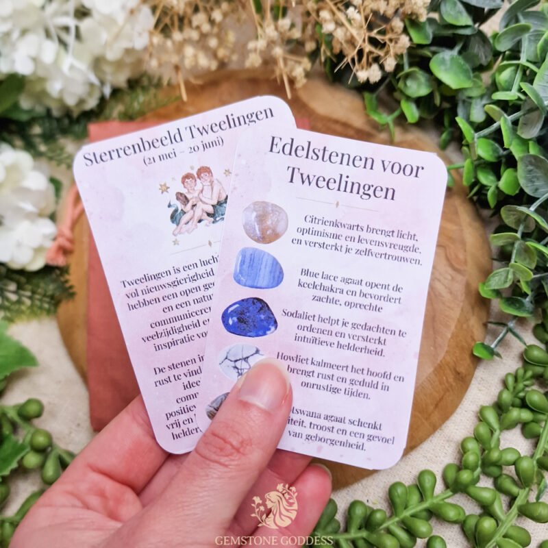 De energie van deze vijf stenen sluit perfect aan bij de speelse, nieuwsgierige en beweeglijke aard van Tweelingen. Ze helpen om gedachten te ordenen, rust te vinden en helder te communiceren vanuit het hart. Draag een of meerdere stenen bij je om je energie in balans te houden, of gebruik ze tijdens meditatie om focus en innerlijke rust te versterken.