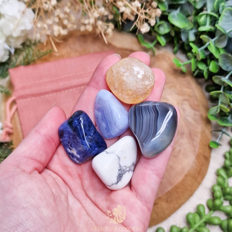 Citrienkwarts brengt licht, optimisme en mentale helderheid, het wekt een positieve kijk en vertrouwen in je eigen ideeën. Blue lace agaat opent de keelchakra en bevordert zachte, eerlijke communicatie. Sodaliet helpt om helder te denken, intuïtie te volgen en hoofd en hart op één lijn te brengen. Howliet brengt kalmte en helpt je gedachten tot rust te laten komen, zodat er ruimte ontstaat voor helderheid en inzicht. Botswana agaat schenkt emotionele balans en geborgenheid, waardoor je stabiel blijft te midden van verandering.