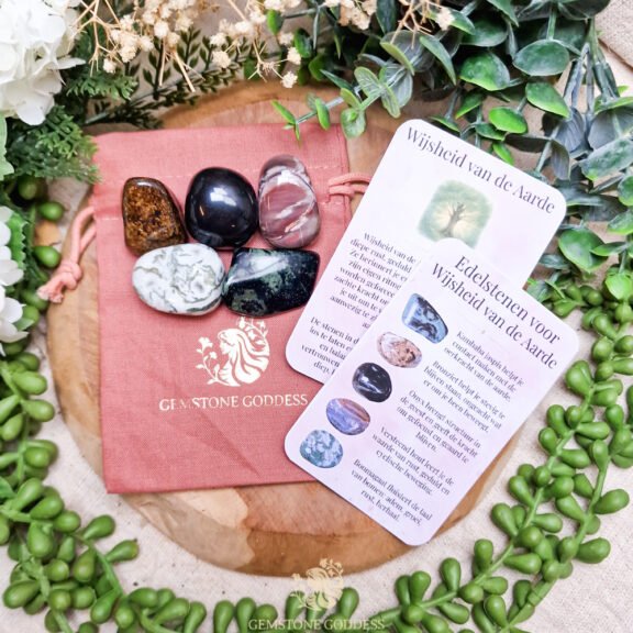 Het getal vijf symboliseert balans tussen alle elementen — aarde, water, vuur, lucht en ether — de natuurlijke harmonie die ook in jou leeft. In deze set vertegenwoordigt elke steen een facet van de aardse wijsheid: