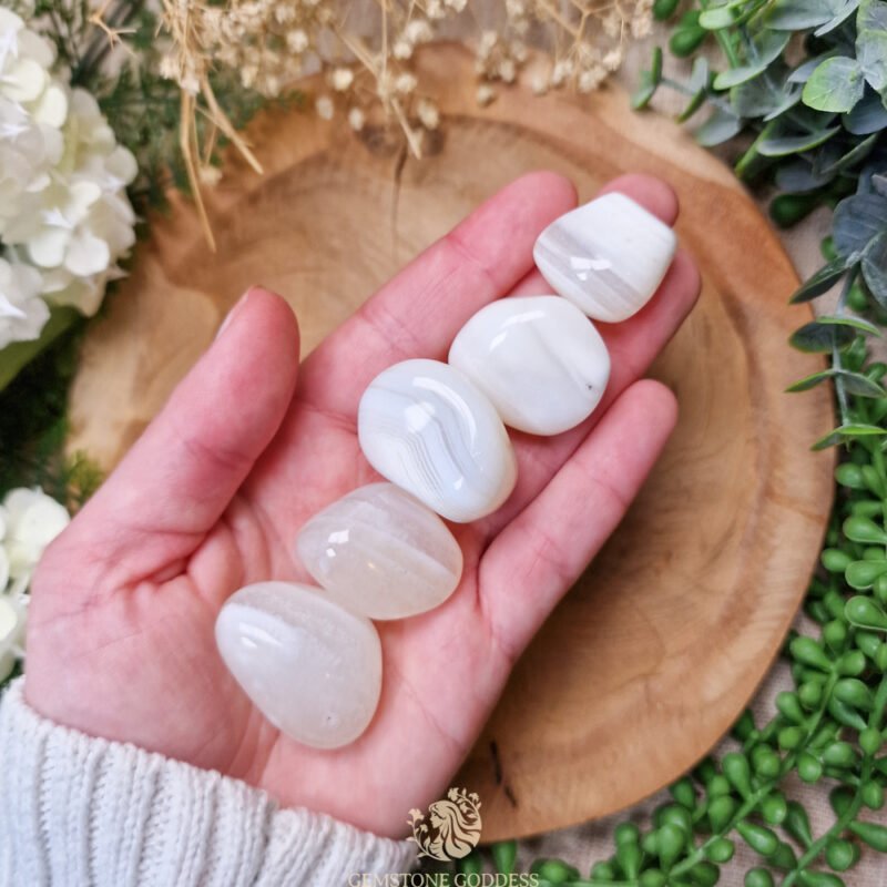 - Draag witte agaat als sieraad of draag een steen bij je voor innerlijke rust en bescherming. Plaats bij je werkplek of meditatieplek om kalmte en balans in je energieveld te brengen. Houd vast wanneer je rust zoekt in onrustige tijden, je emoties wilt verzachten of je behoefte hebt aan zachte bescherming en helderheid.