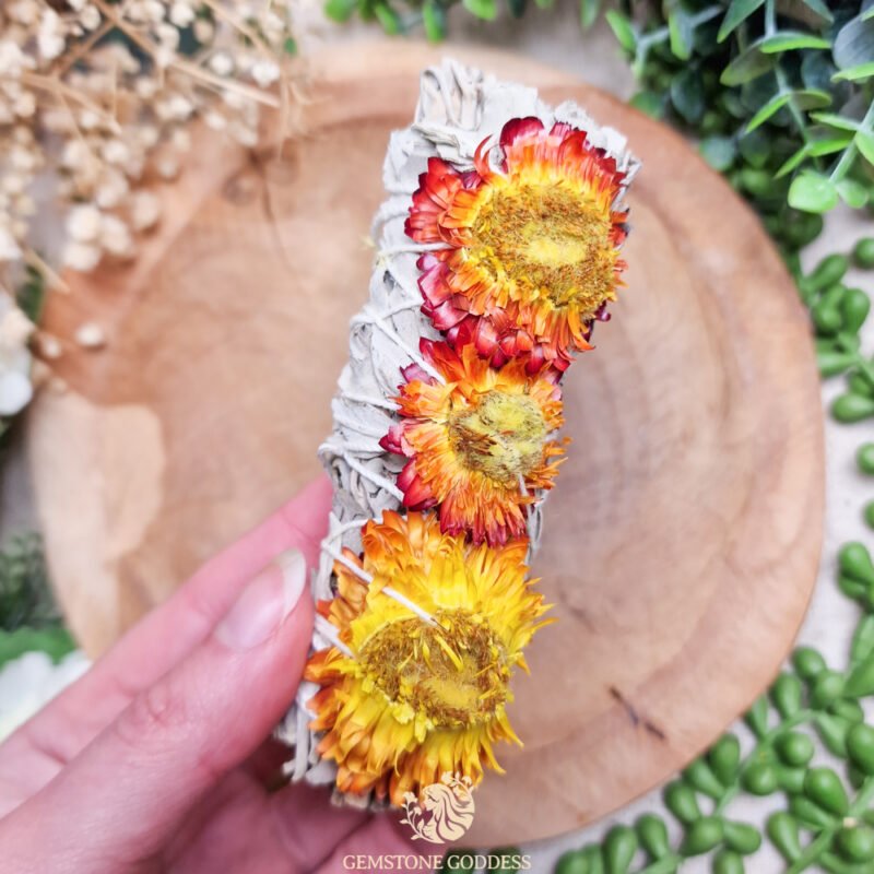 Witte salie met immortelle combineert diep reinigende energie met zachte warmte, veerkracht en vernieuwing. Witte salie is een krachtige en eeuwenoude plant die traditioneel wordt gebruikt voor reiniging, zuivering en energetische vernieuwing. Zorgvuldig gedroogd en gebonden tot een smudge stick, versierd met immortellebloemen, wordt dit heilige kruid al generaties lang gebruikt om vastzittende energie te verwijderen, het evenwicht te herstellen en een gevoel van vrede te creëren in een ruimte of ritueel.