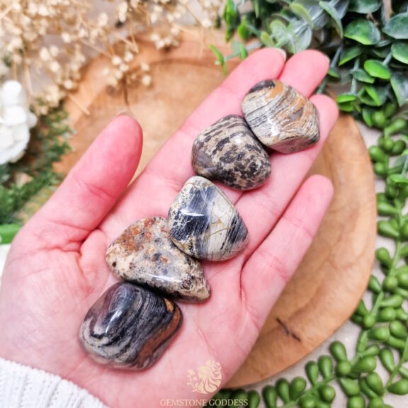 Zilverblad jaspis is een steen van stabiliteit, aarding en innerlijke kracht. Zijn kenmerkende zilvergrijze patronen, vaak verweven met zwarte, bruine of beige tinten, symboliseren de verbondenheid met de aarde en de cyclische beweging van het leven.