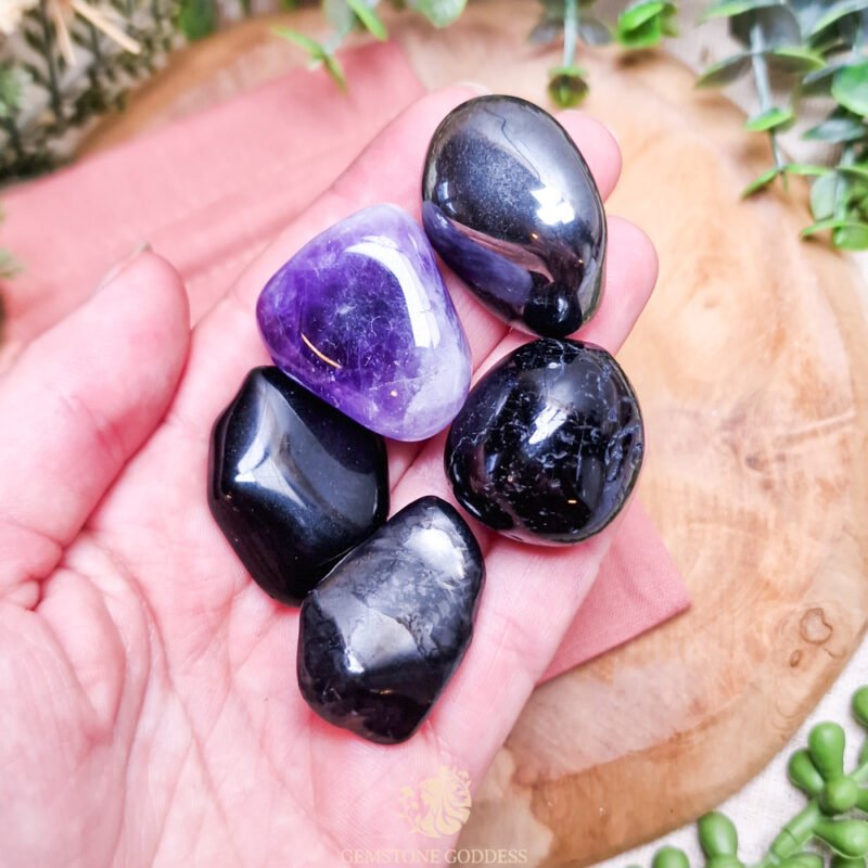 Gebruik deze set tijdens meditatie, reinigingsrituelen of in je dagelijkse praktijk van bescherming. Leg de stenen in een cirkel om je heen tijdens meditatie, houd zwarte obsidiaan of toermalijn vast voor directe afweer, en eindig met amethist of shungiet om je veld weer te vullen met licht. Adem diep, voel de aarde onder je, en stel je voor dat je omhuld wordt door een schild van helder licht dat niets toelaat wat jouw rust verstoort.